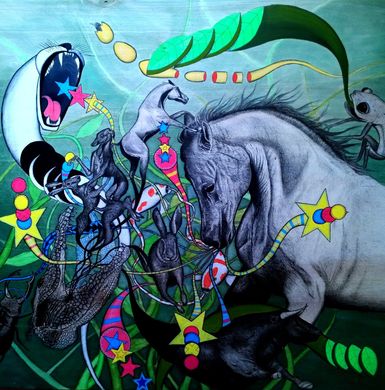 Mit einem simplen schwarzen Graphitstift entstehen, durch den hell-dunkel Kontrast und die schroffen Striche intensiv wirkende Abbildungen, trotz fehlender Farbe. Dazu verbinden sich farbige Elemente, die diesen Kontrast noch betonen. Sehr real gezeichnete Figuren stellen, als weiterer Kontrast, ein surreales Gebilde aus Lebewesen da.